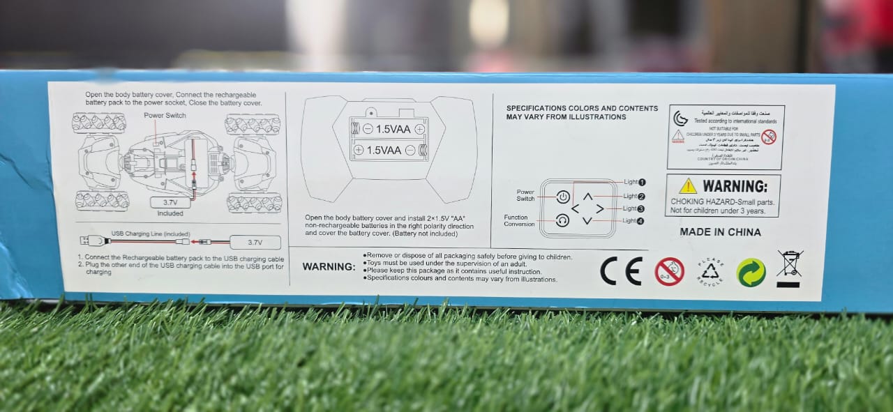 • Rechargeable Power: The car is powered by a 3.7V rechargeable battery pack (included), while the remote requires two 1.5V AA batteries.