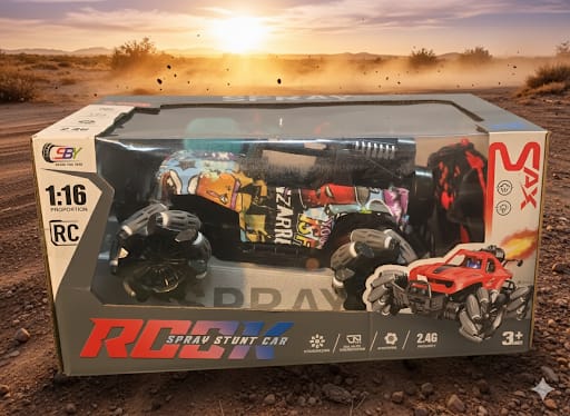 This RC Spray Stunt Car is a high-performance off-road vehicle built for stunts and visual flair. It is designed with a 1:16 proportion and features specialized “Mecanum” wheels that allow it to move in ways standard cars cannot. The standout feature is its “Spray” function, which emits a mist from the rear to simulate a real exhaust trail, especially when combined with its internal lighting.