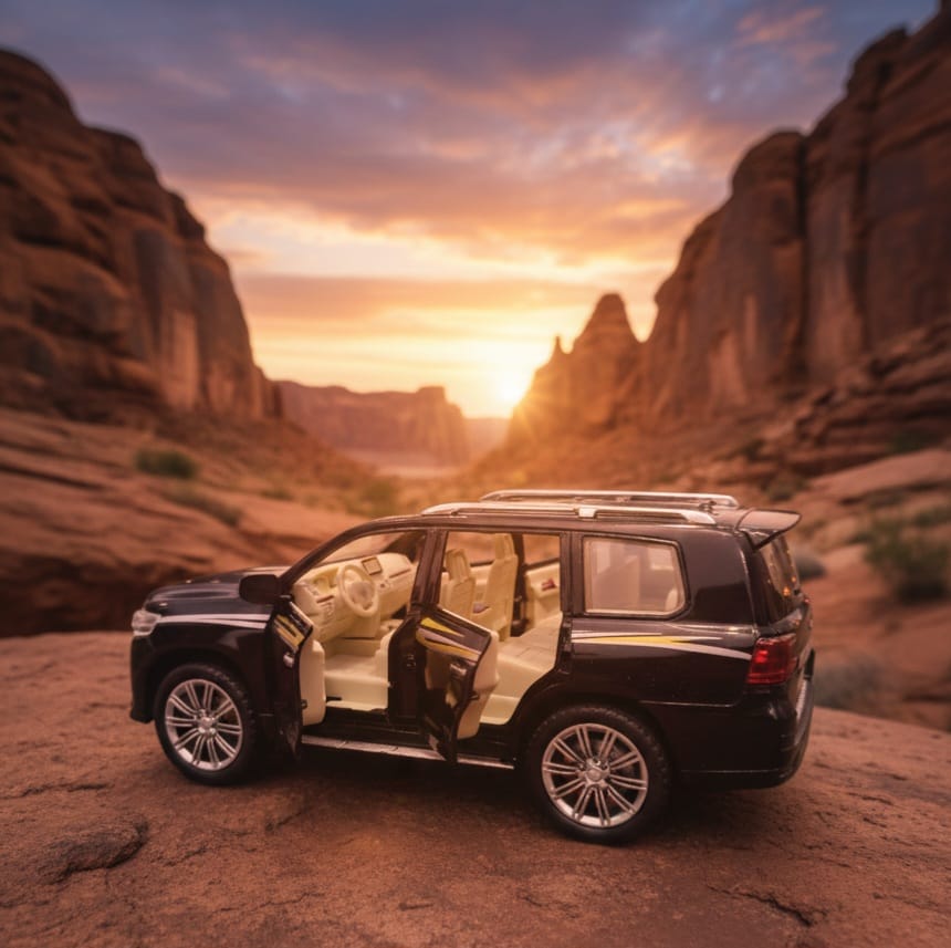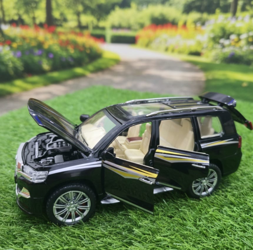 This premium die-cast model is a highly detailed 1:24 scale replica of the iconic Toyota Land Cruiser V8. Crafted with a durable metal body and a sleek glossy black finish, it features authentic styling including side decals, realistic interior beige upholstery, and a sunroof. Designed for both collectors and children, this model brings the “King of the Road” to life with interactive moving parts and electronic effects that mimic the real luxury SUV experience.