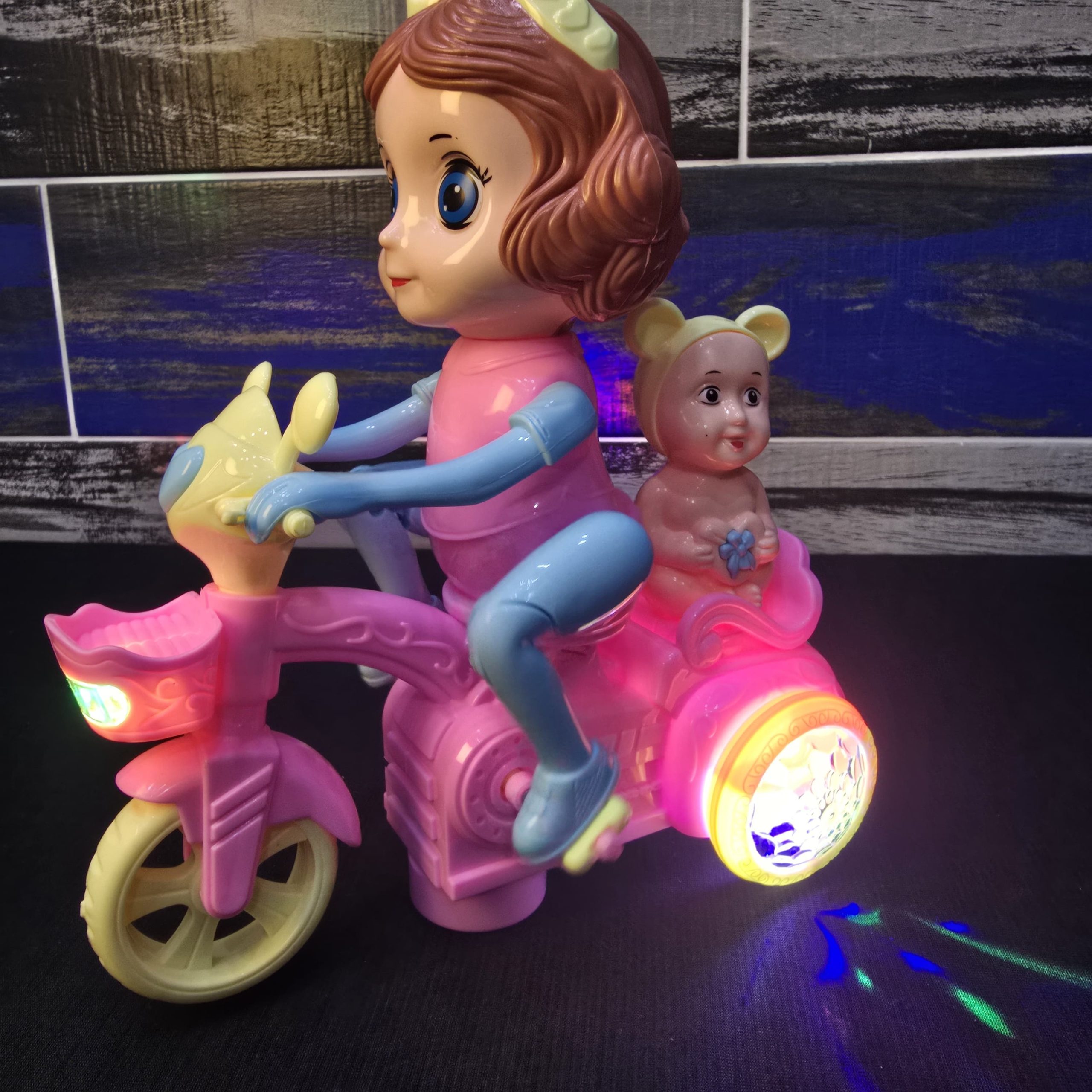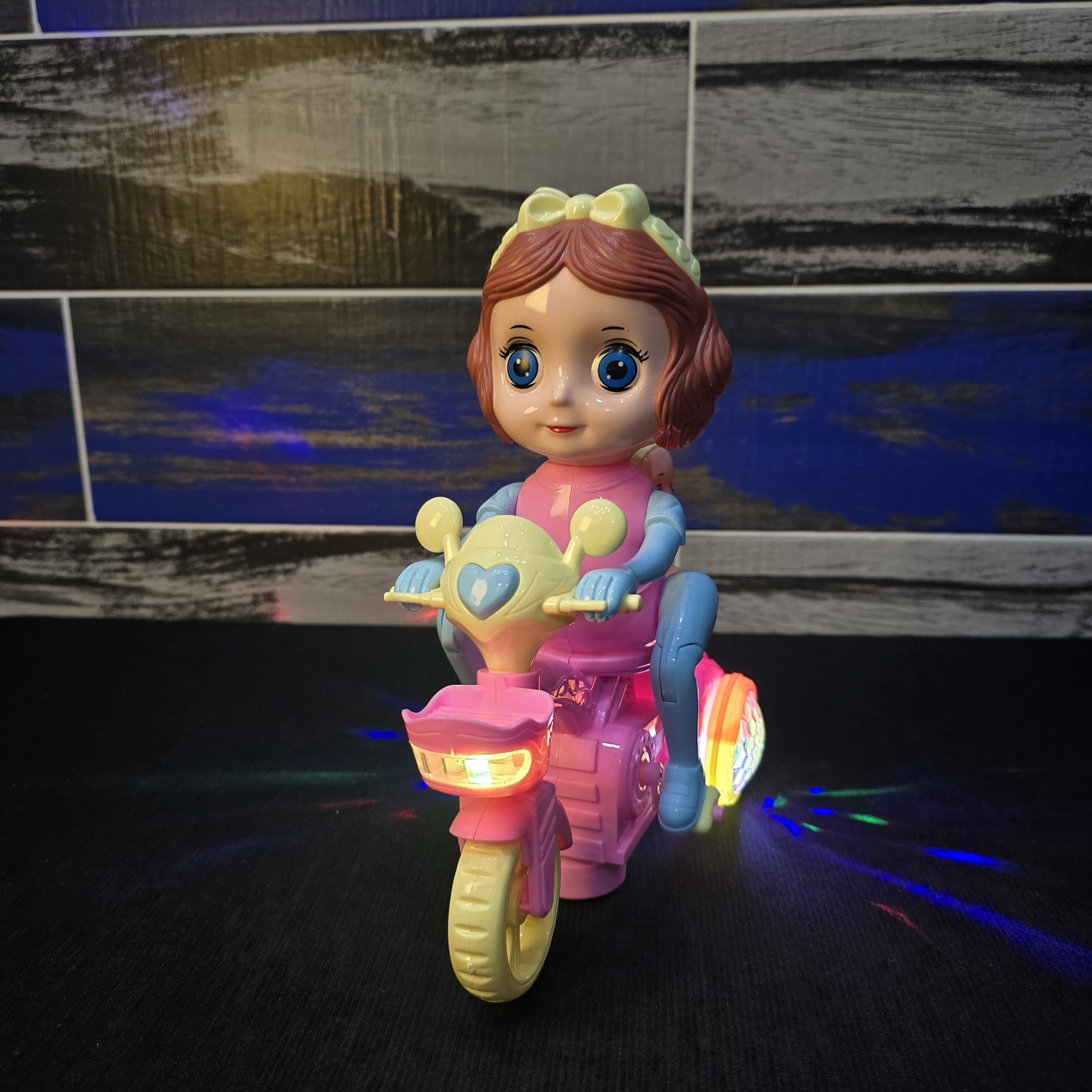 “Glaring Light” Effects: As highlighted on the box, the rear wheels and front headlight contain multi-colored LEDs. These are often coupled with translucent, faceted plastic to create a disco-ball projection effect on the floor.