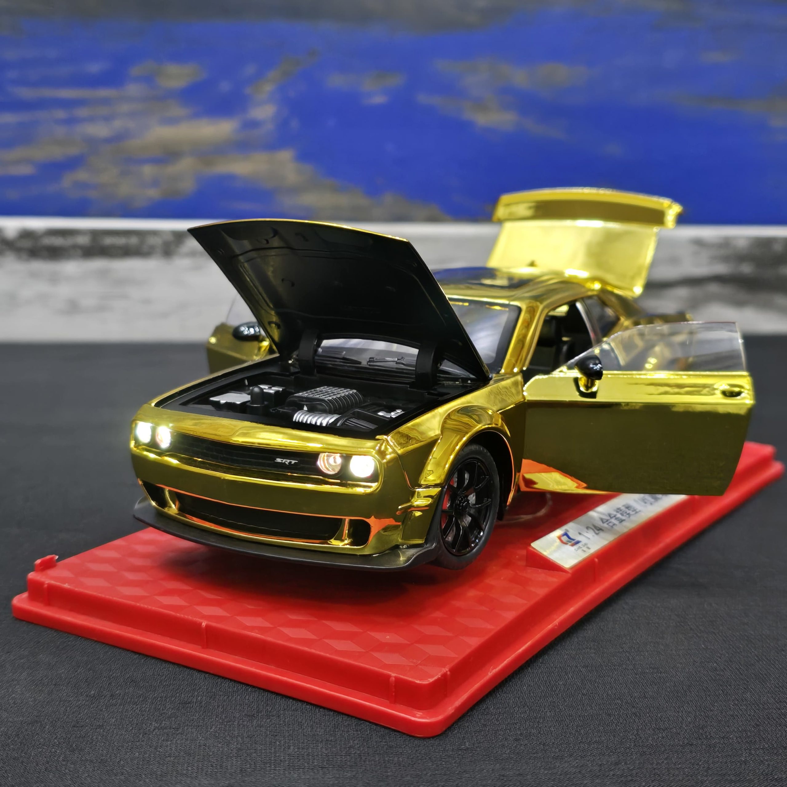 This is a highly detailed 1:24 scale replica of the iconic American muscle car. It features an eye-catching reflective gold exterior that mimics a custom metallic wrap. The model is designed with several functional parts, including an opening hood that reveals a detailed supercharged HEMI engine, opening doors, and an opening trunk. It is a popular collector’s piece, often produced by brands like Maisto or Jada, combining “Widebody” styling with black racing rims and red brake calipers.