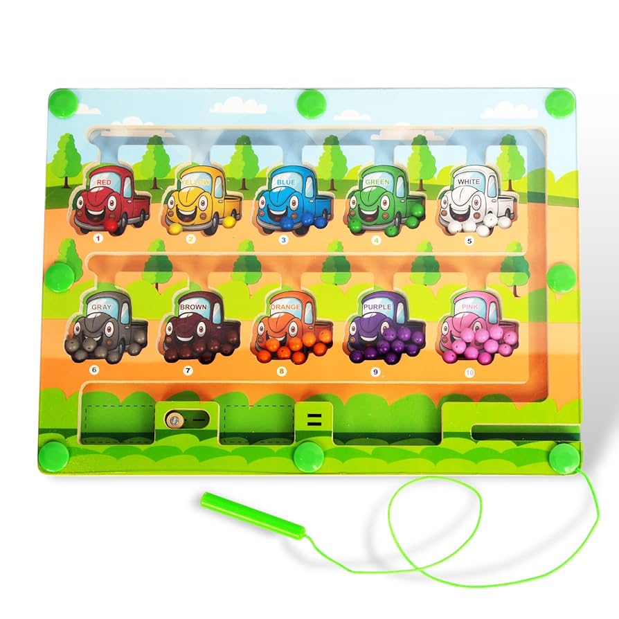 This wooden activity board features a variety of colorful cartoon cars, each assigned a specific color and number. Using a connected magnetic wand, children navigate small colored beads through a maze to match them with the corresponding car. This “screen-free” toy is specifically built to combine STEM learning with fun, helping children understand basic mathematical concepts and color categorization in a mess-free, self-contained format.