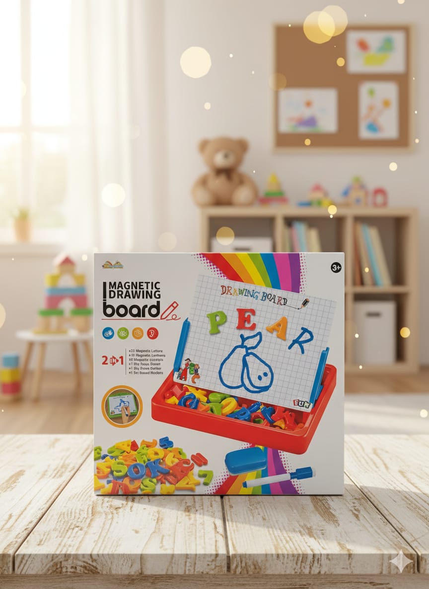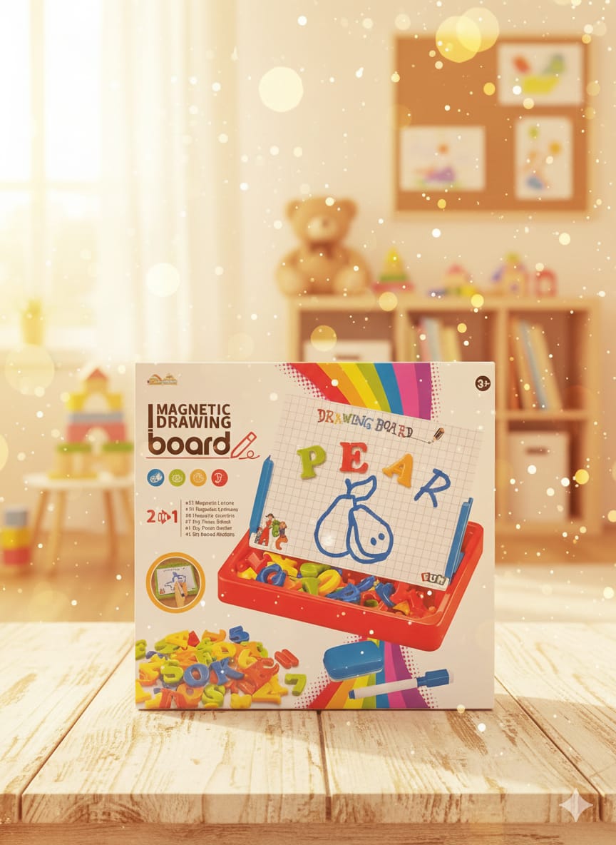 2-in-1 Learning System: Combines a dry-erase drawing board with a magnetic surface for letters and numbers.