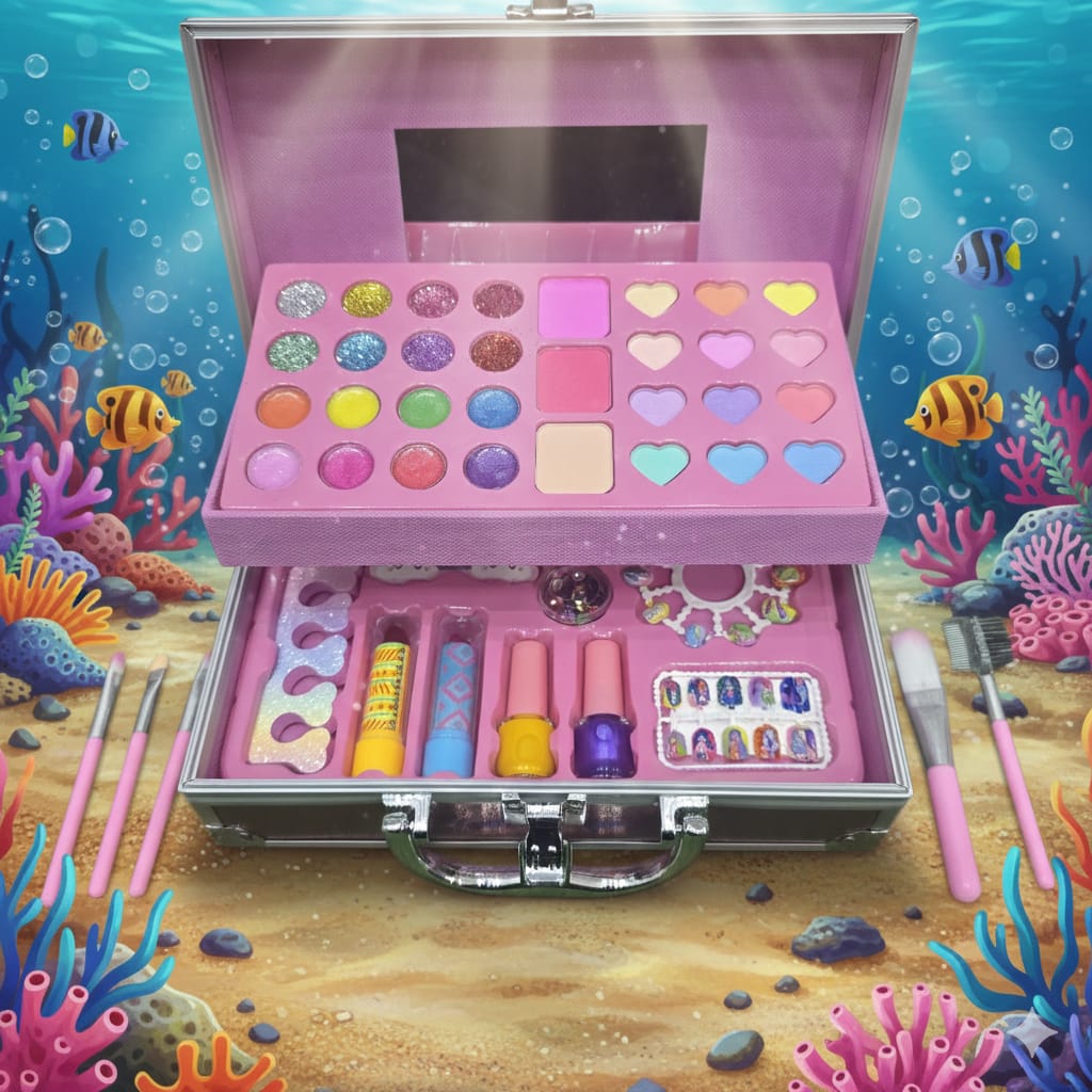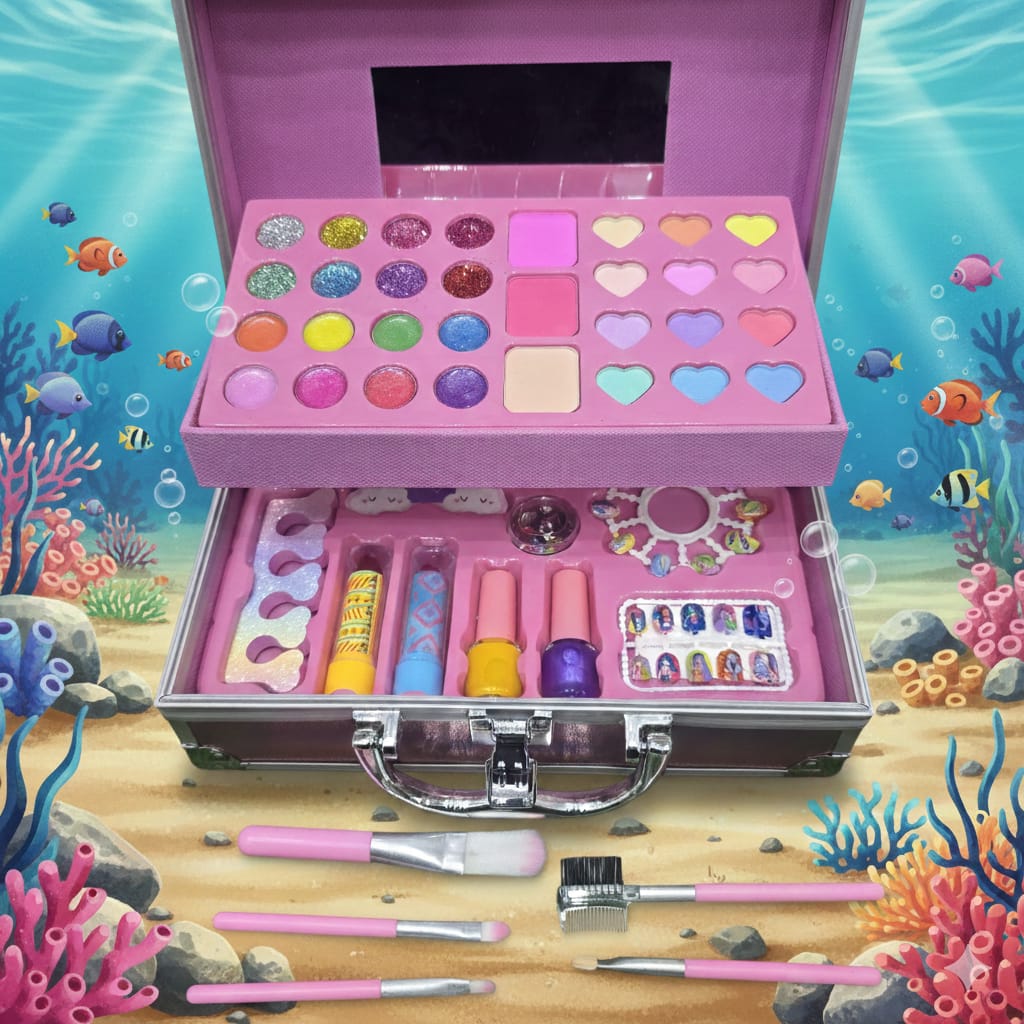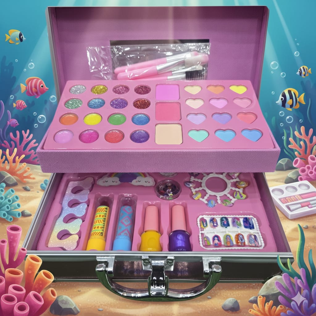 Dive into a world of glamour with this Mermaid-themed “Shining” makeup vanity case. This large, 46-piece set is housed in a professional-style metallic silver carry case featuring a beautiful mermaid illustration. It offers a massive variety of colors and tools for children to explore their artistic side, all while keeping their “beauty tools” organized in a sturdy, portable box.