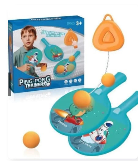 The Ping-Pong Trainer is an innovative indoor sports toy designed to help children practice table tennis without the need for a traditional table. It features a unique suspended design where the ball is attached to a retractable rope system. This setup allows for solo play or interaction with a partner, helping to improve hand-eye coordination, reaction time, and physical fitness in a compact space. The set includes colorful paddles featuring fun “Dinosaur” and “Astronaut” themes.