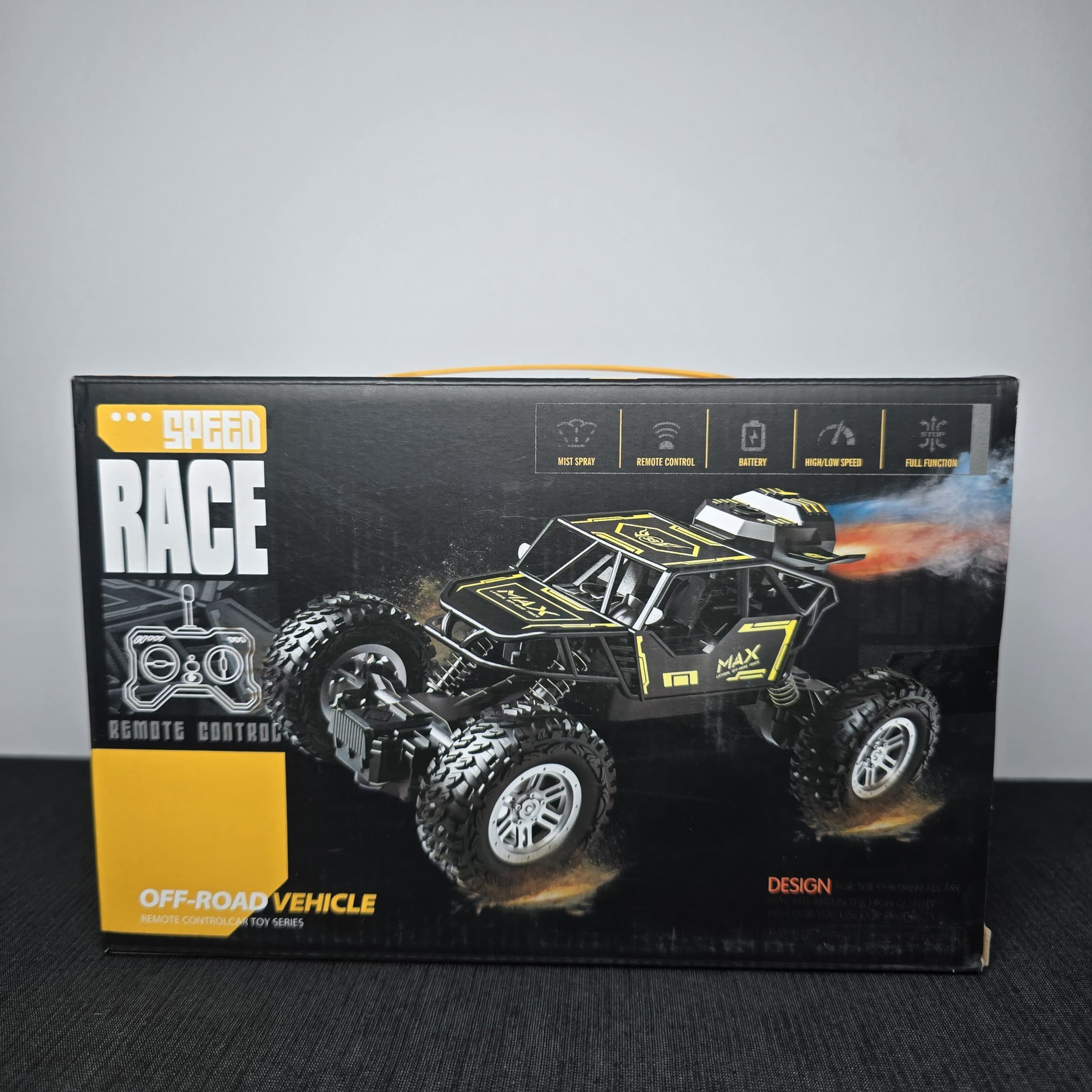 Off-Road Suspension: Looking at the model on the box, the vehicle features large, deep-tread rubber tires and visible coil-spring shock absorbers, which are essential for navigating uneven terrain.